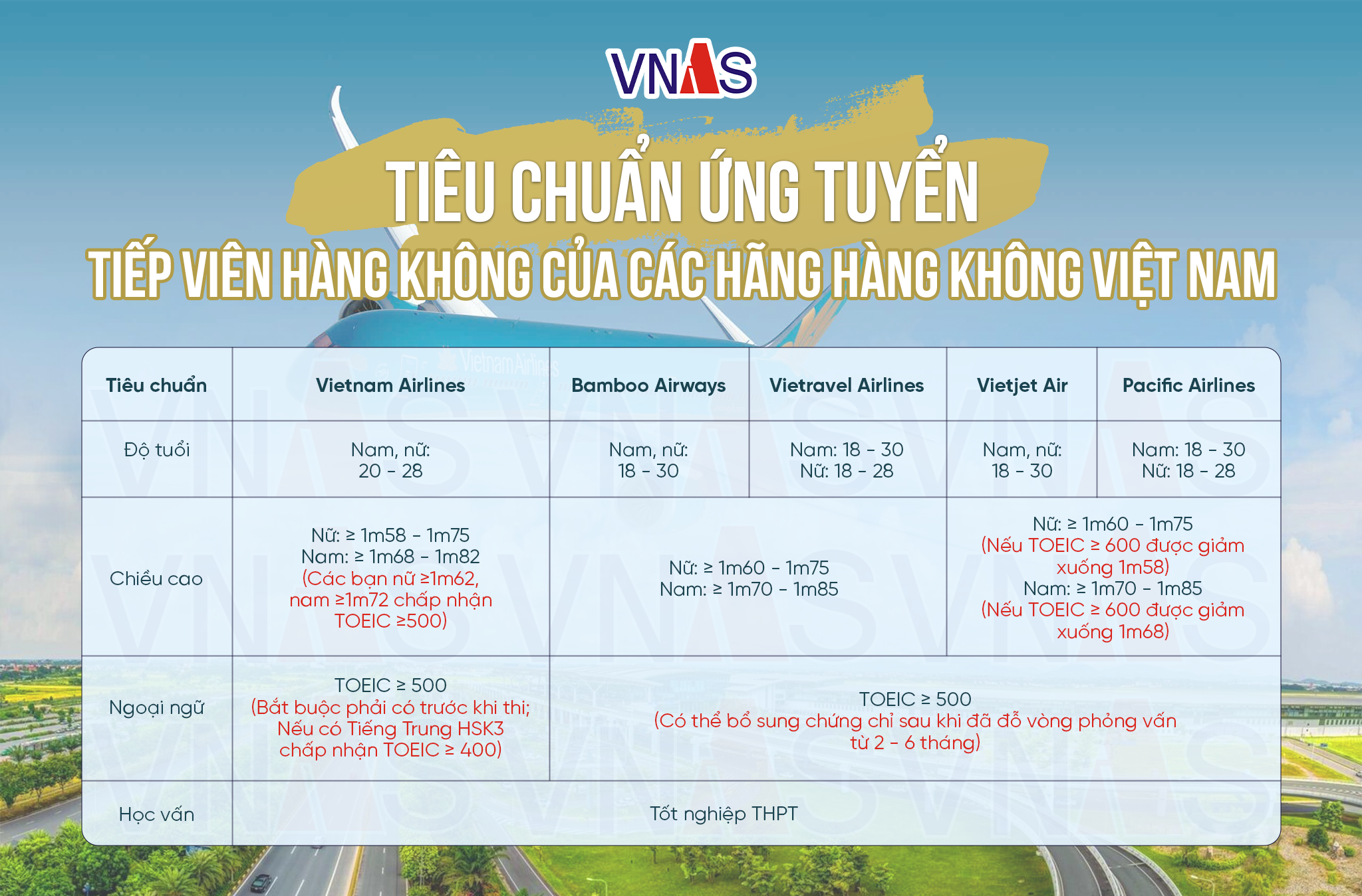 Trường Hàng Không VNAS đã tổng hợp một bảng tiêu chí sơ bộ để các bạn học viên có thể xem một cách dễ dàng hơn. Các tiêu chí này là những yêu cầu cơ bản quan trọng của các hãng, tuy nhiên ngoài những tiêu chí dưới đây vẫn còn rất nhiều những tiêu chí nhỏ khác mà VNAS sẽ tiếp tục lên bài trong thời gian sắp tới!