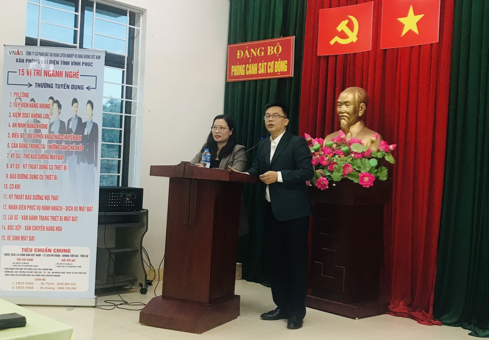 Ngày 4/12 vừa qua, Văn phòng Đại diện Công ty Cổ phần Đào tạo Huấn luyện Nghiệp vụ Hàng không Việt Nam (VNAS) tại tỉnh Vĩnh Phúc đã phối hợp với Phòng Cảnh sát Cơ động Công an tỉnh Vĩnh Phúc tổ chức Chương trình hướng nghiệp nghề hàng không cho hạ sỹ quan, chiến sỹ xuất ngũ.